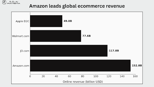 - In 2024, Amazon.com generated 152.8 billion dollars, JD.com 117.8 billion, Walmart.com 77.6 billion, and Apple’s D2C channel nearly 49 billion dollars in online revenue.