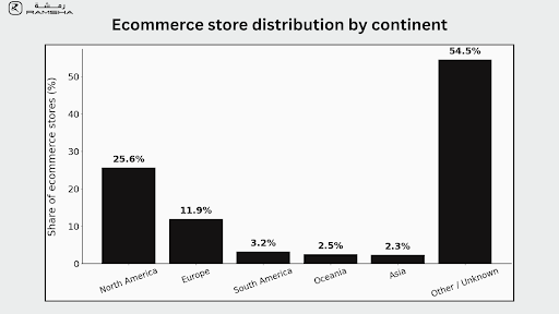 Global e-commerce infrastructure is unevenly distributed, with North America and Europe hosting the largest share of online stores.