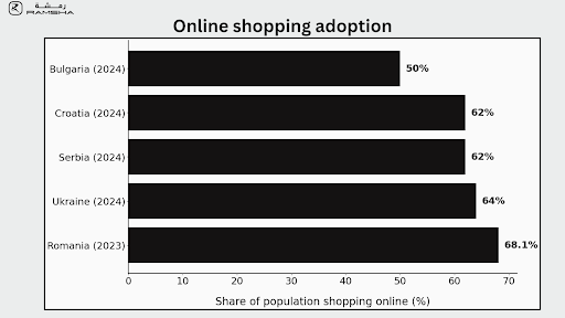 - In Romania, 68.1% of internet users made online purchases in 2023, with increased adoption in rural areas.