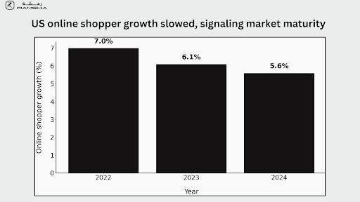 Yes. In the United States, online shopper growth slowed to 5.6% in 2024, down from 7% in 2022 and 6.1% in 2023. This shows market maturity.