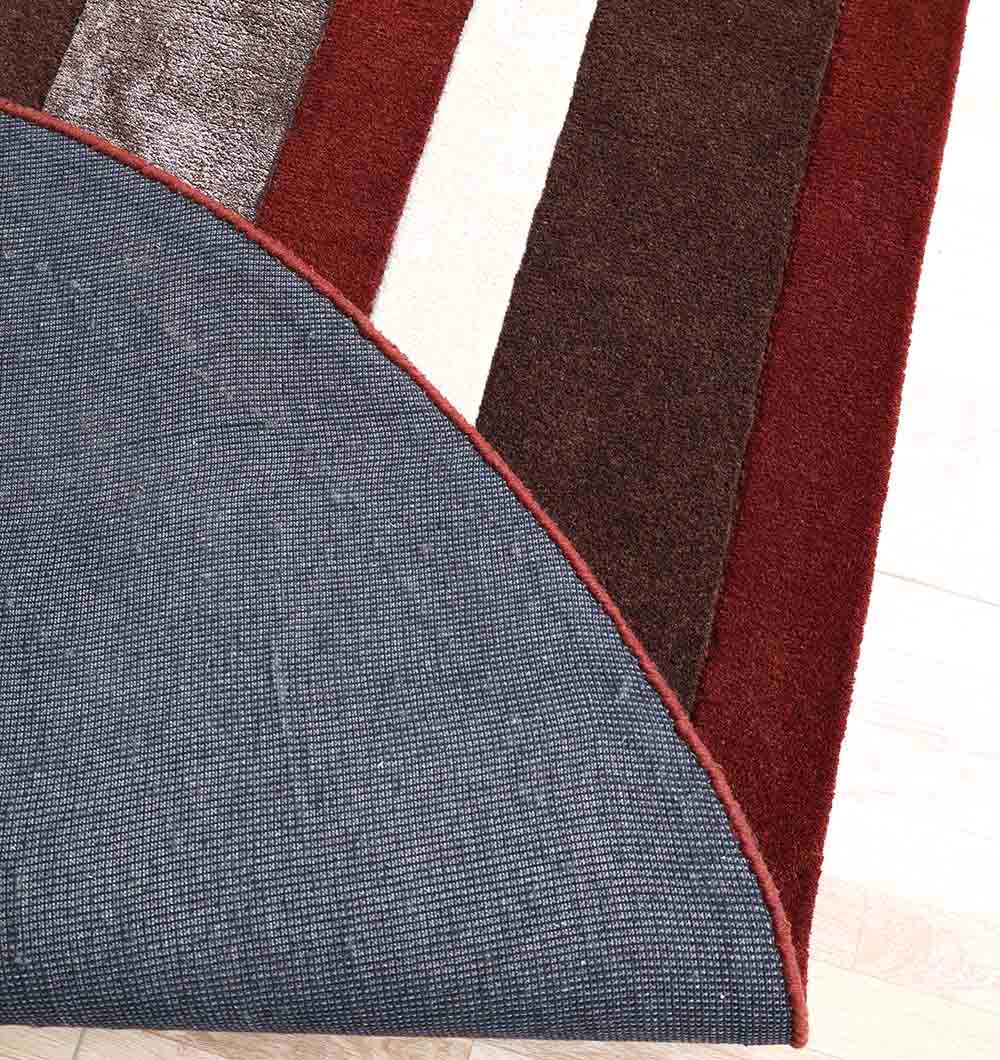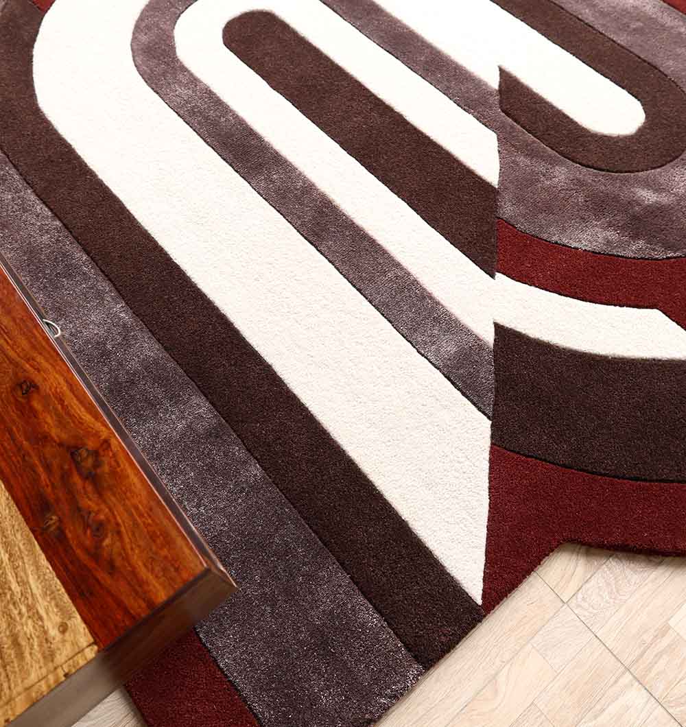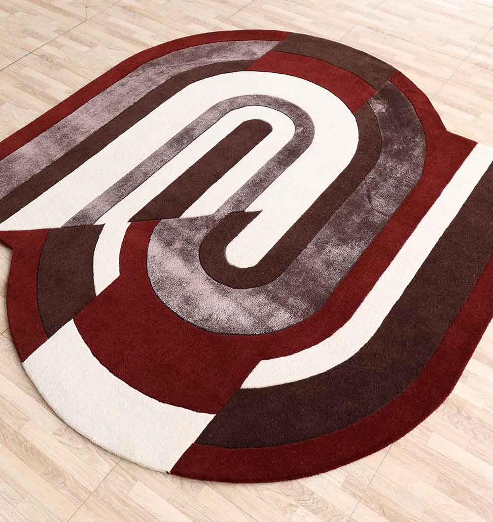 The HTWV-184 Modern Geometric Shaped Rug is a high-concept artisanal floor covering that brings a bold, architectural edge to contemporary interiors. This 200×226 cm rug features a unique, interlocked horseshoe-inspired silhouette with a striking color palette of deep maroon, charcoal grey, and crisp white. Hand-finished from a premium blend of 50% wool, 30% viscose, and 20% cotton, it provides a dense 1.5 cm pile height that feels exceptionally soft yet maintains a sophisticated, low-sheen finish. Weighing 20 kg, this substantial handmade rug offers superior stability and durability, making it an ideal choice for high-traffic lounges or artistic office spaces. Its non-traditional asymmetrical form and bold striped pattern serve as a powerful visual anchor, transforming any floor into a canvas of modern luxury.