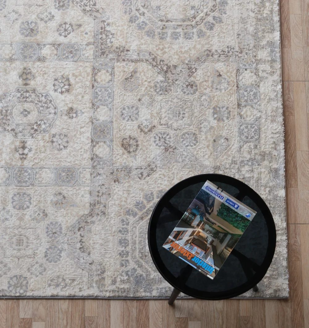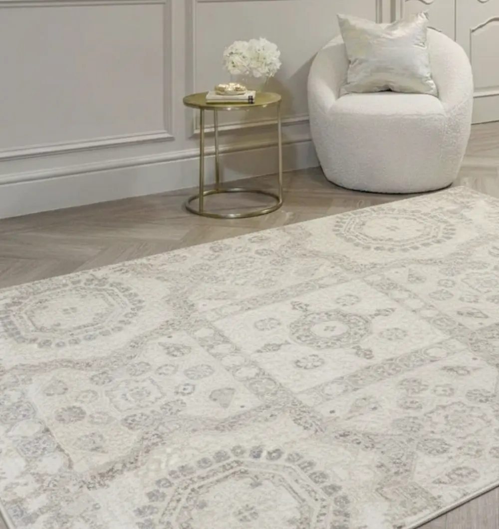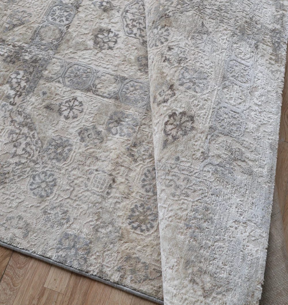 Featuring a beautiful traditional medallion pattern in soft, versatile shades of grey, beige, and cream, this rug seamlessly complements both classic and contemporary home d?cor styles. Use this durable floor covering to define your living room, add warmth to a dining area, or create an inviting entrance in your hallway. The MMB-31 area rug is expertly machine-made for exceptional durability and longevity. The composition is a practical blend of 80% Polyester and 20% Cotton, offering a soft underfoot feel while being resilient enough for daily use in busy areas. The polyester component provides excellent color fastness and wear resistance, ensuring your rug maintains its beauty for years.
