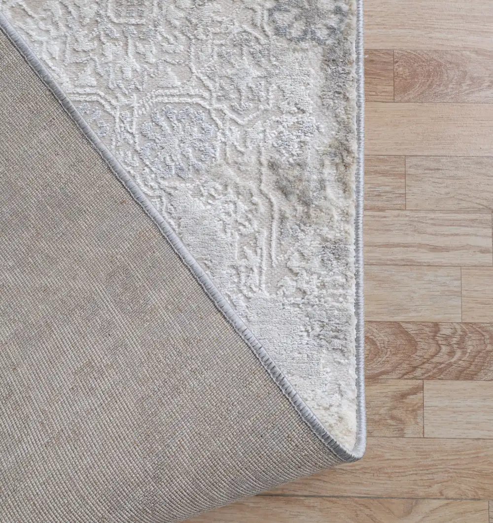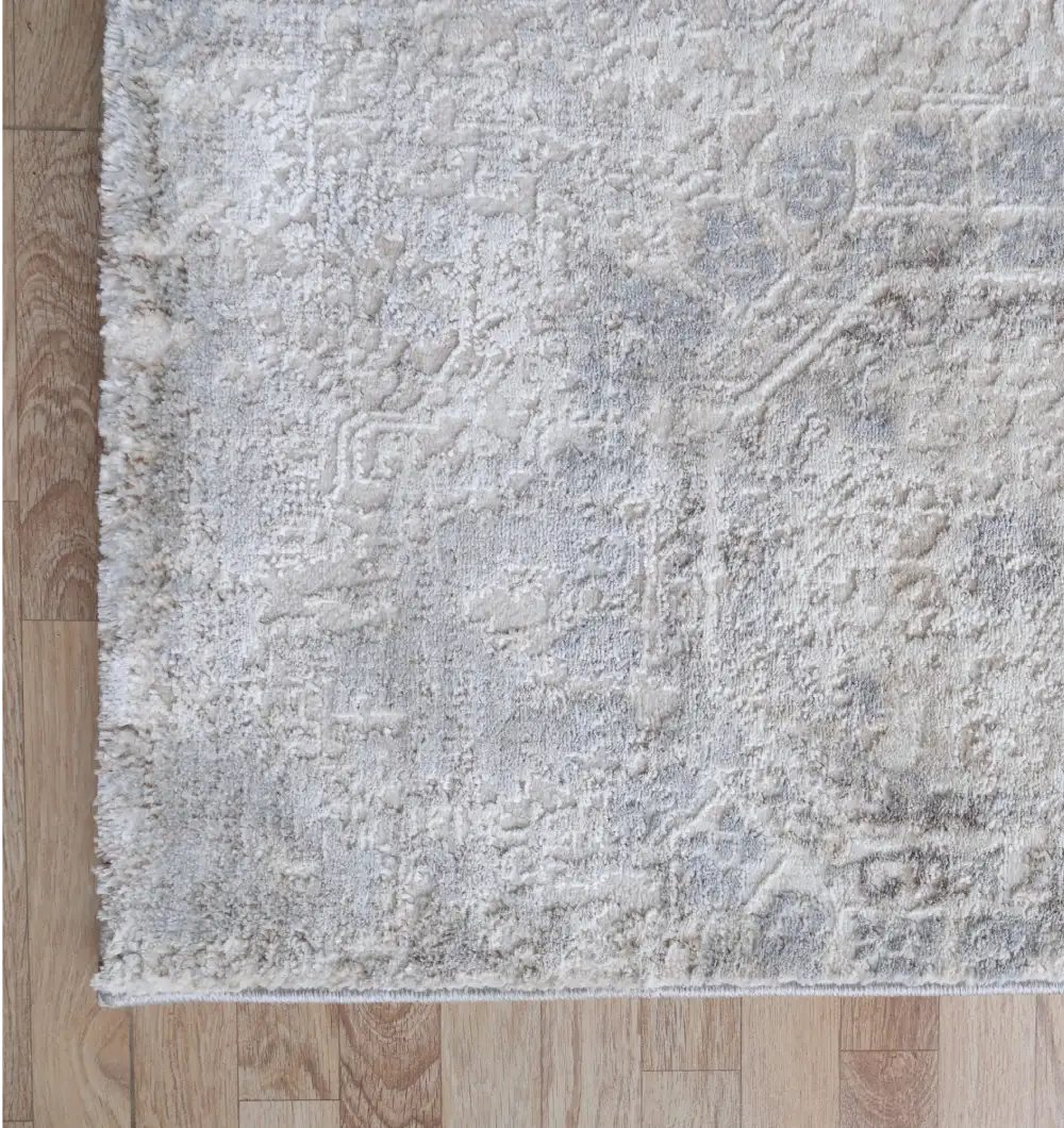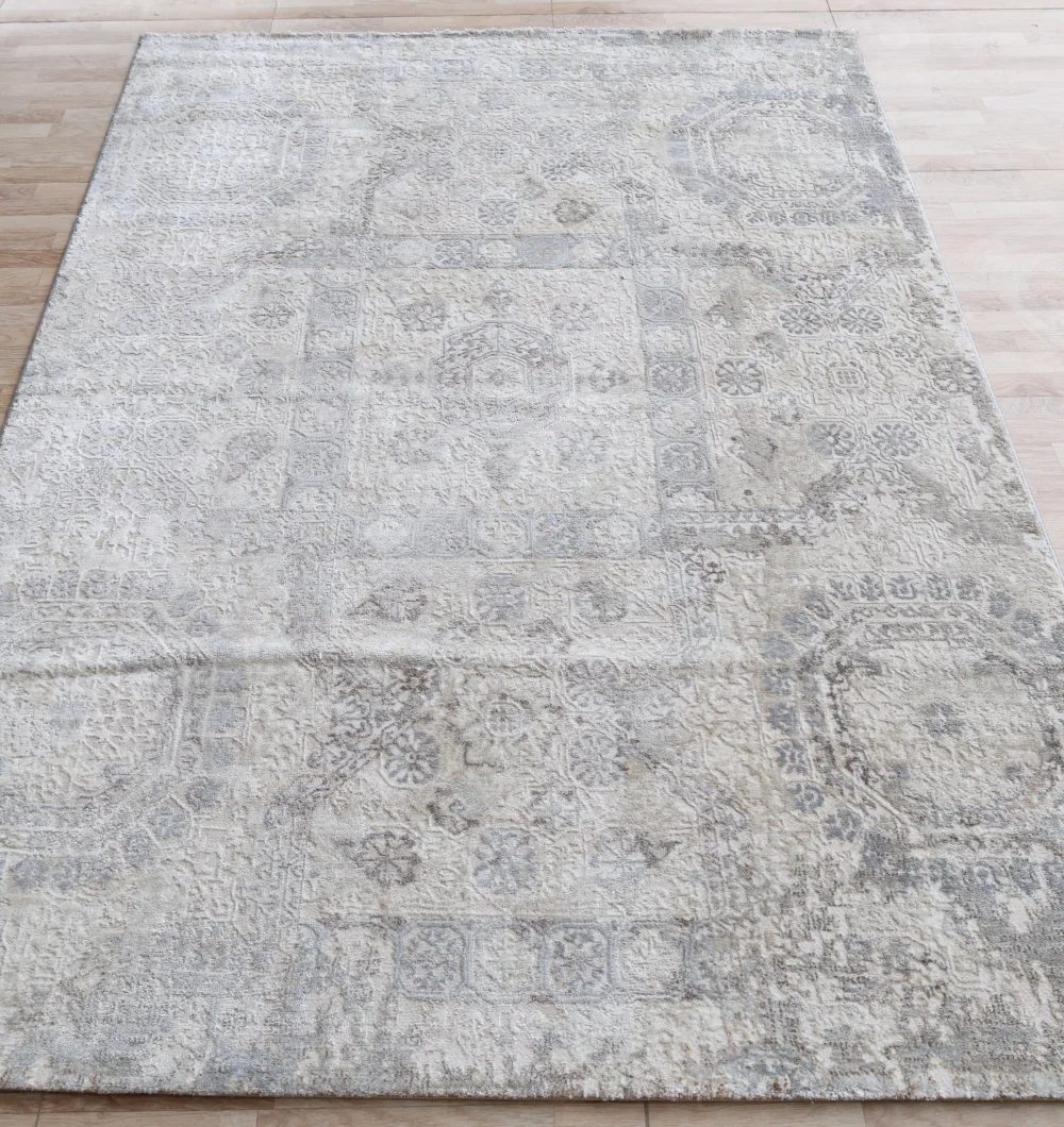 Featuring a beautiful traditional medallion pattern in soft, versatile shades of grey, beige, and cream, this rug seamlessly complements both classic and contemporary home d?cor styles. Use this durable floor covering to define your living room, add warmth to a dining area, or create an inviting entrance in your hallway. The MMB-31 area rug is expertly machine-made for exceptional durability and longevity. The composition is a practical blend of 80% Polyester and 20% Cotton, offering a soft underfoot feel while being resilient enough for daily use in busy areas. The polyester component provides excellent color fastness and wear resistance, ensuring your rug maintains its beauty for years.