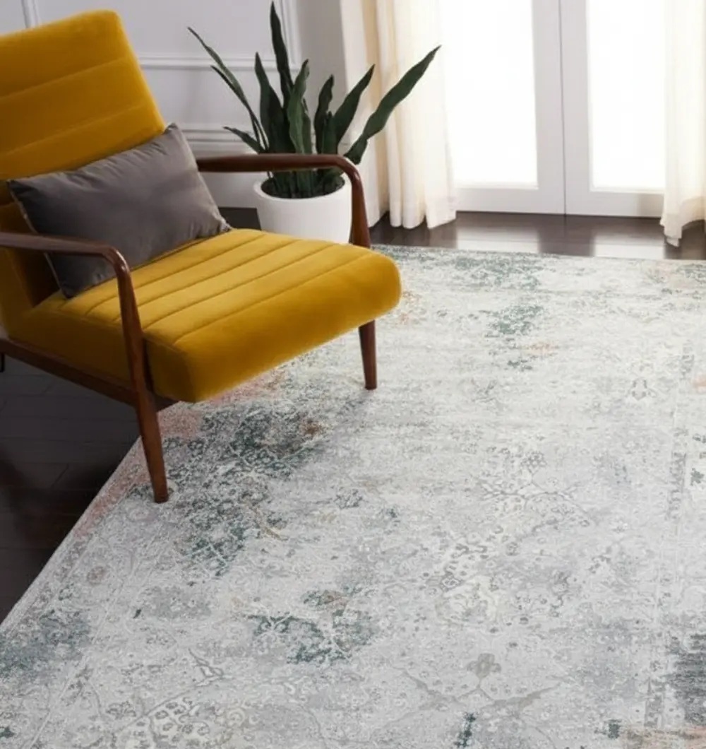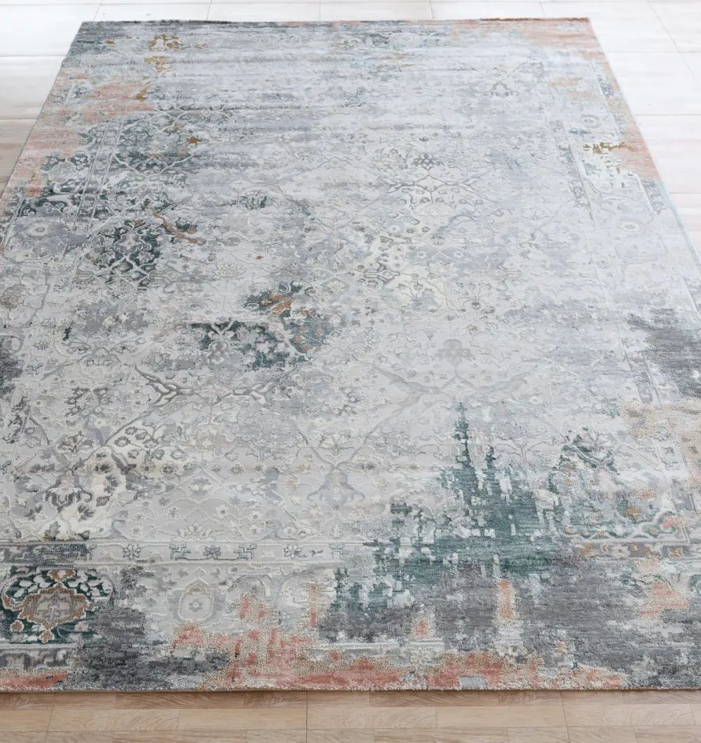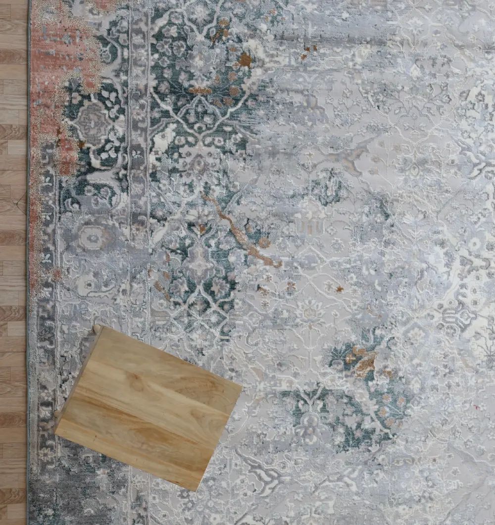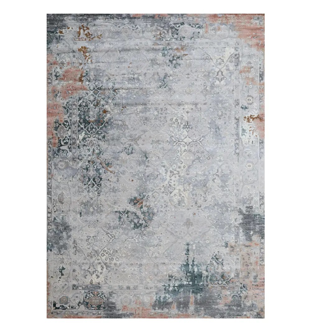 The MMB-50 carpet showcases a sophisticated blend of grey, teal, and subtle rust tones in a beautifully distressed pattern that brings depth and character to any room. Crafted from 100% polyester, it offers long-lasting durability, soft texture, and easy maintenance. Its generous 270?360 cm size makes it ideal for living rooms, lounges, and contemporary d?cor spaces seeking a refined yet artistic touch.