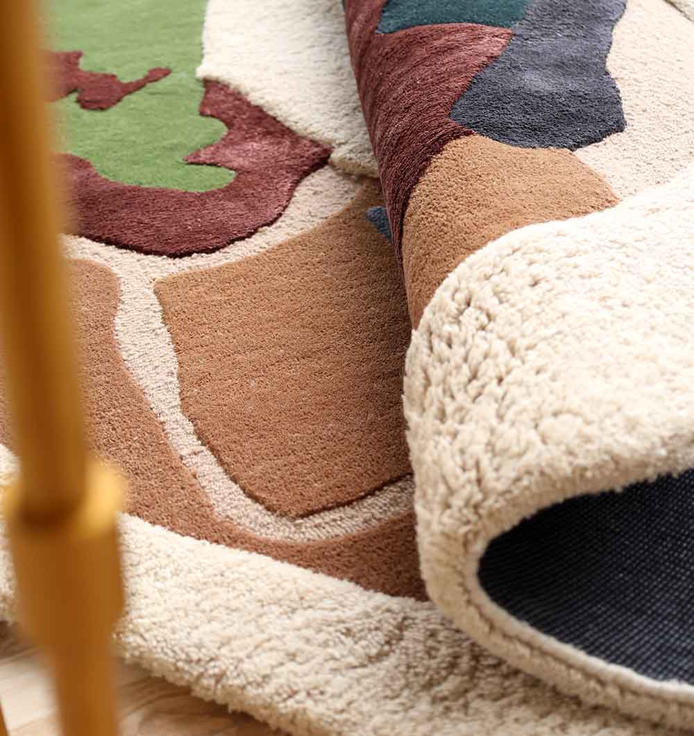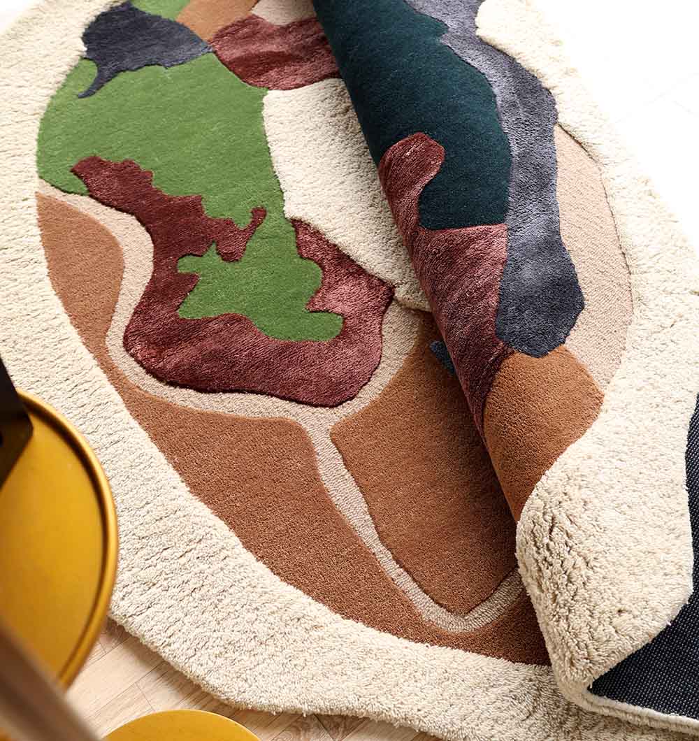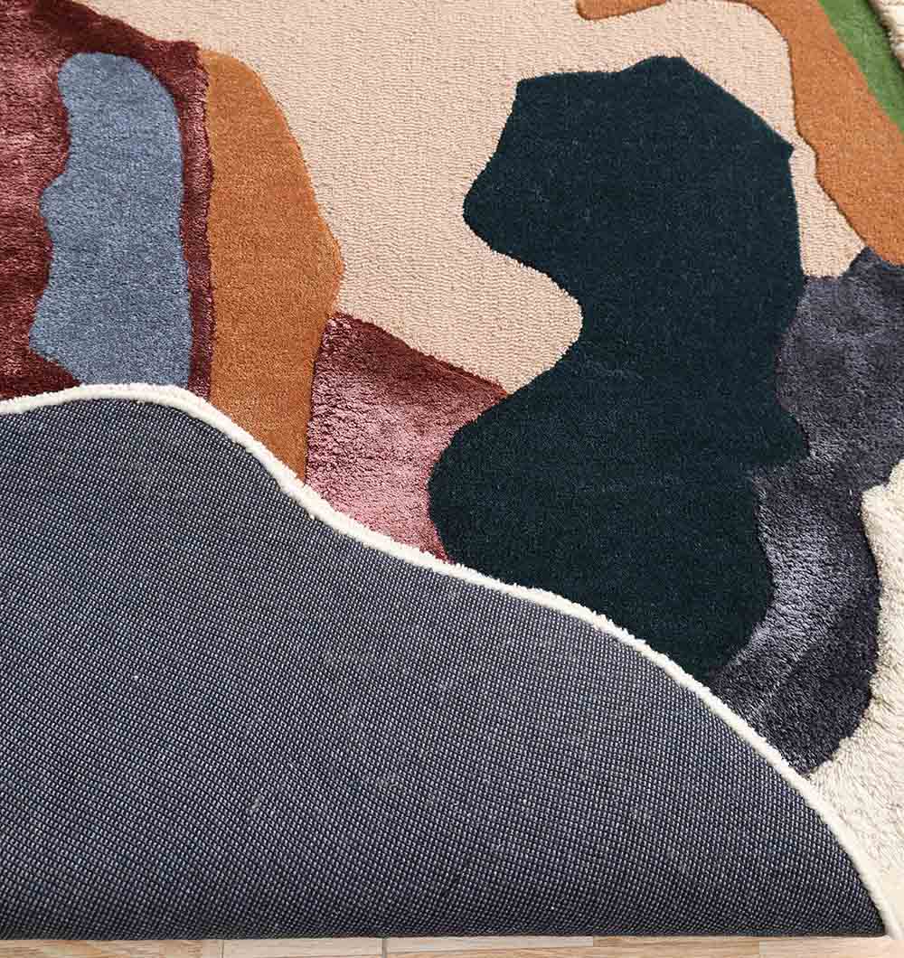 The HTWV-181 Earth Tone Abstract Shaped Rug is a premium, artisan-crafted floor covering that serves as a sophisticated focal point for modern interiors. This 200 cm shaped rug features a complex, nature-inspired palette of moss green, deep terracotta, charcoal, and warm beige, arranged in a fluid, map-like abstract pattern. Meticulously handcrafted from a luxurious blend of 50% wool, 30% viscose, and 20% cotton, it boasts a dense 1.5 cm pile height that combines the rugged durability of wool with the silky, reflective sheen of viscose. Weighing 18 kg, this high-density rug offers exceptional stability and sound-dampening qualities. Its unique irregular silhouette and rich, organic color story make it an ideal choice for anchoring eclectic living rooms, creative studios, or contemporary bedrooms.
