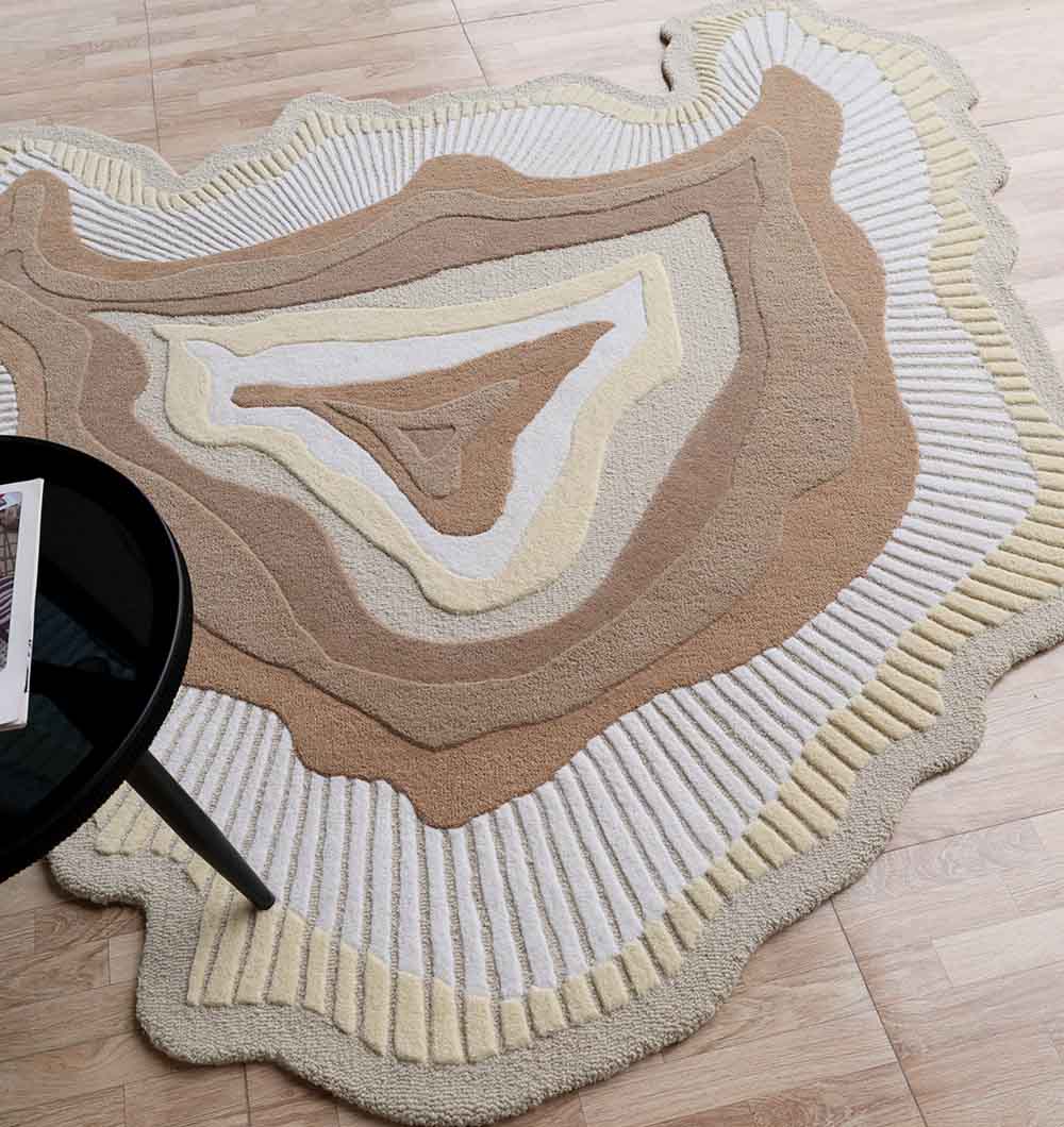 The HTW-124 Sculptural Earth Tone Rug is a masterclass in organic design, bringing the serene aesthetic of natural geodes and topographic formations to your interior. This 200 cm shaped statement piece features a mesmerizing, multi-layered composition of concentric ripples in soft cream, warm beige, and deep tan. Hand-carved details along the outer ridges create a striking three-dimensional texture that enhances its unique, irregular silhouette. Expertly handcrafted from a premium heavy-duty blend of 80% wool and 20% cotton, it offers a substantial weight of 18 kg, ensuring exceptional durability and floor stability. With a plush 1.5 cm pile height, it provides superior underfoot warmth and sound insulation. This rug’s sophisticated neutral palette and artisanal form make it a perfect choice for minimalist living rooms, modern bedrooms, or any space seeking a luxurious, nature-inspired focal point.