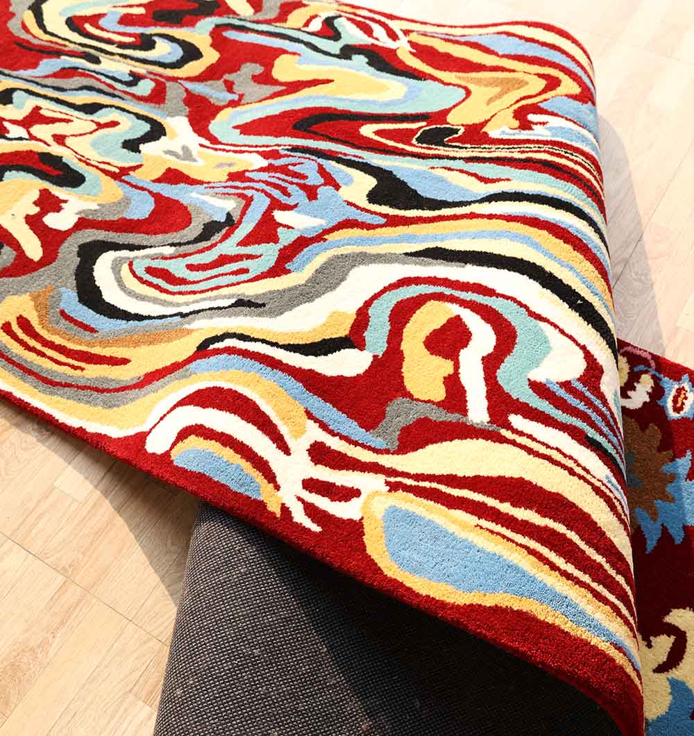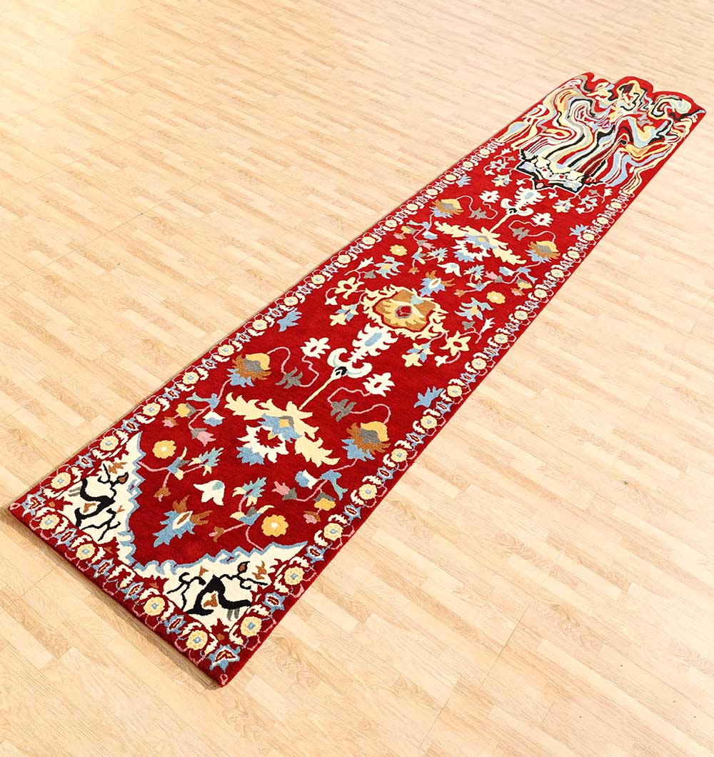 The HTW-118 Melting Persian Runner Rug is a provocative piece of contemporary floor art that reimagines classical heritage through a surrealist lens. This striking handmade runner begins with a traditional, high-detail Persian floral motif in a vibrant crimson red, which dramatically “melts” into a fluid, psychedelic pool of multi-colored swirls at the base. Expertly handcrafted from a premium heavy-duty blend of 80% wool and 20% cotton, this rug is designed for both visual impact and long-lasting durability in hallways or gallery spaces. The intricate transition from structured geometric patterns to organic, liquid-like forms creates a stunning 3D visual effect, making it a perfect conversation piece for avant-garde homes, creative studios, or maximalist interiors seeking a blend of history and modern edge.