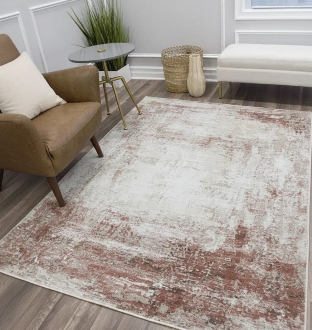 Warm rust tones blend beautifully with soft beige shades to create a rich, distressed abstract pattern that enhances modern and classic interiors alike. Crafted from 100% polyester, the MMB-48 carpet offers a smooth texture, durable quality, and easy care. Its generous 270?360 cm size makes it perfect for living areas, lounges, and open spaces needing a bold yet elegant visual impact.